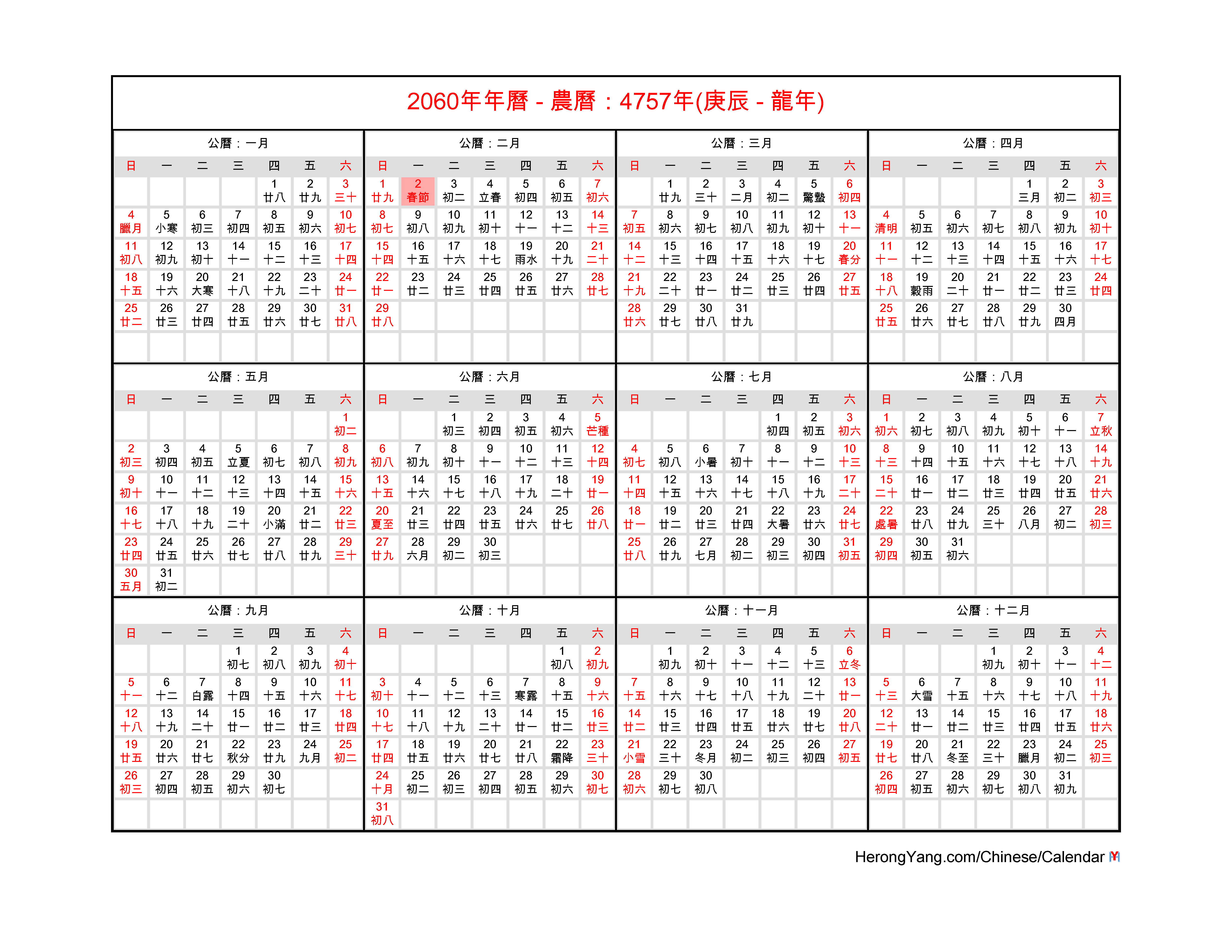 Want to know when is the 2060 Chinese New Year day? Look for free Chinese calendars for 2060?