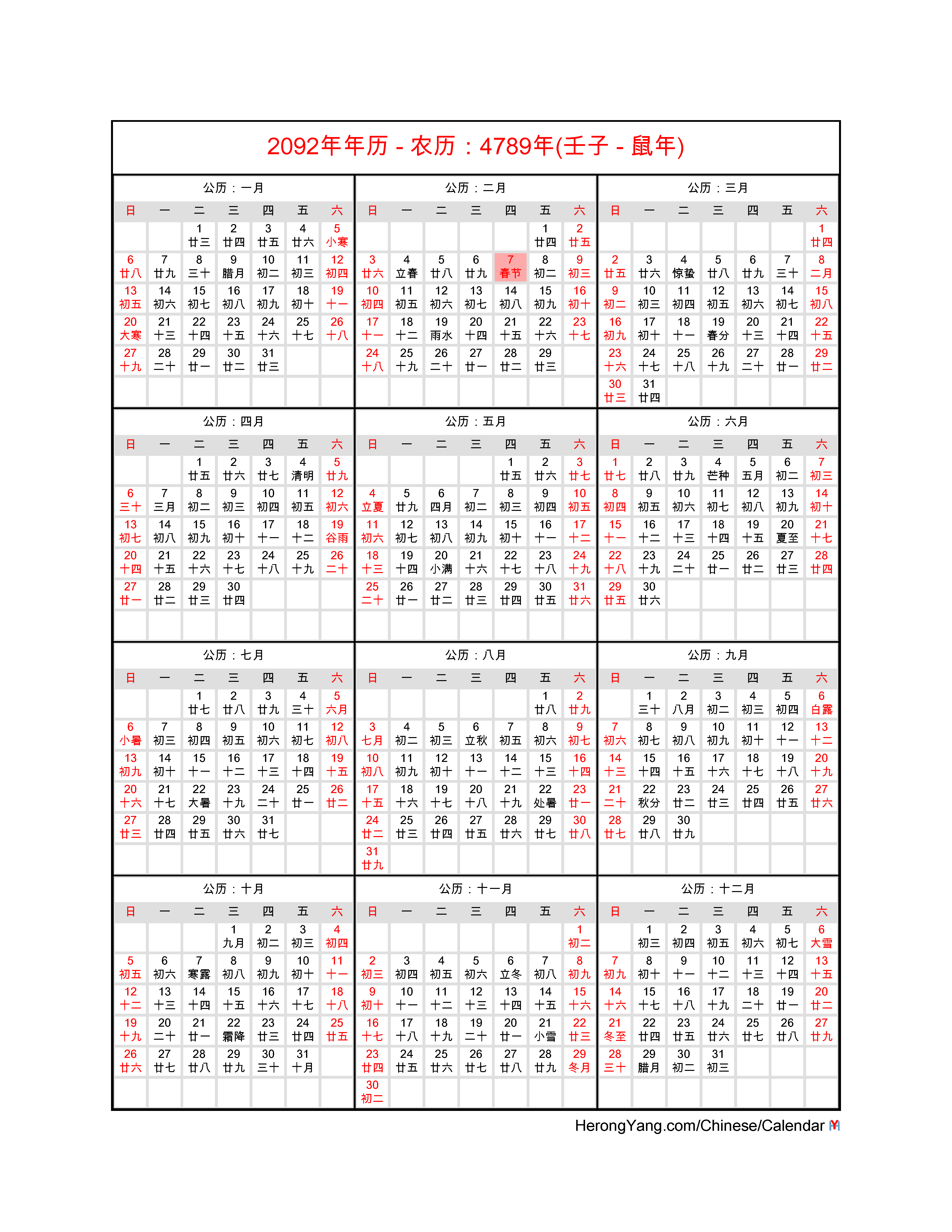 Want to know when is the 2092 Chinese New Year day? Look for free Chinese calendars for 2092?