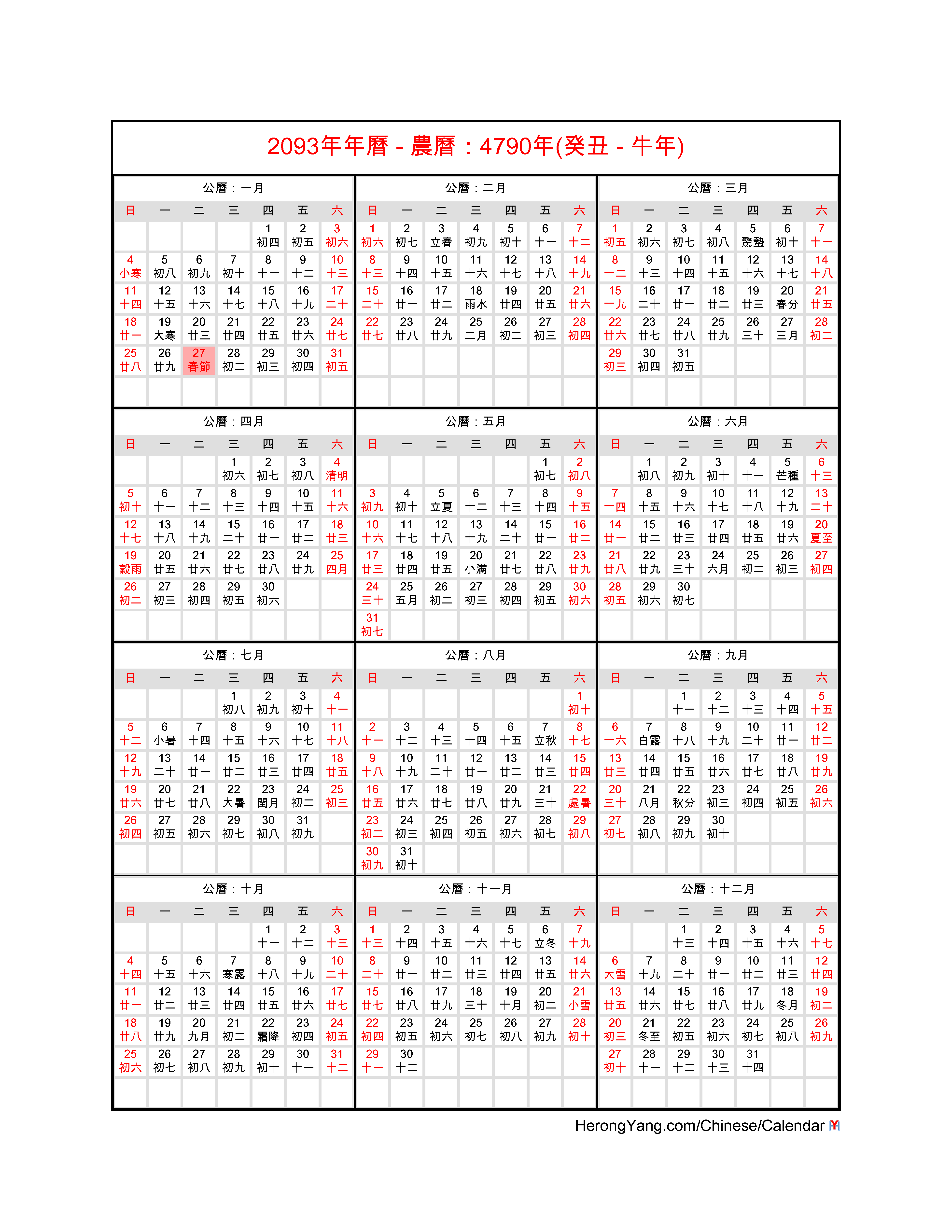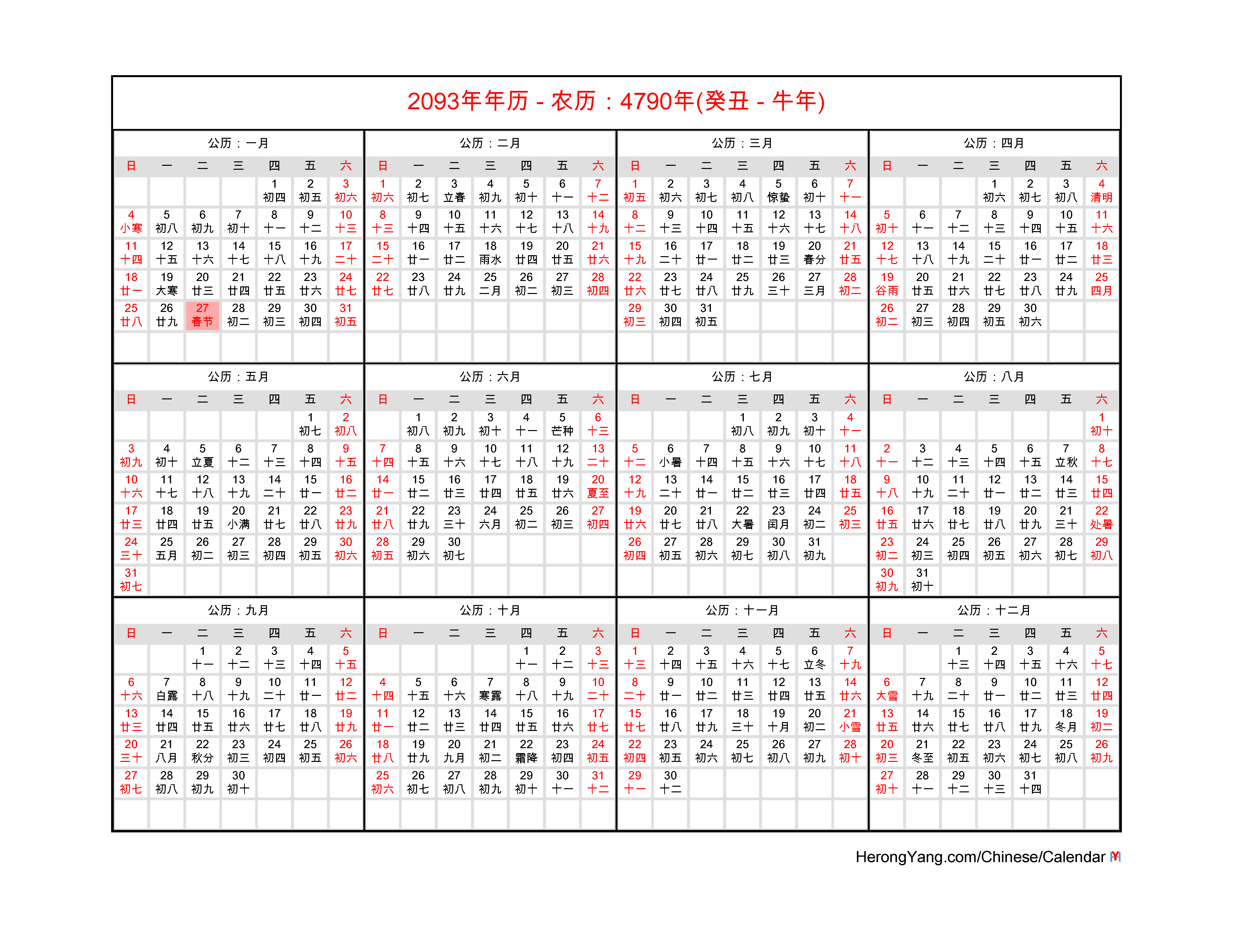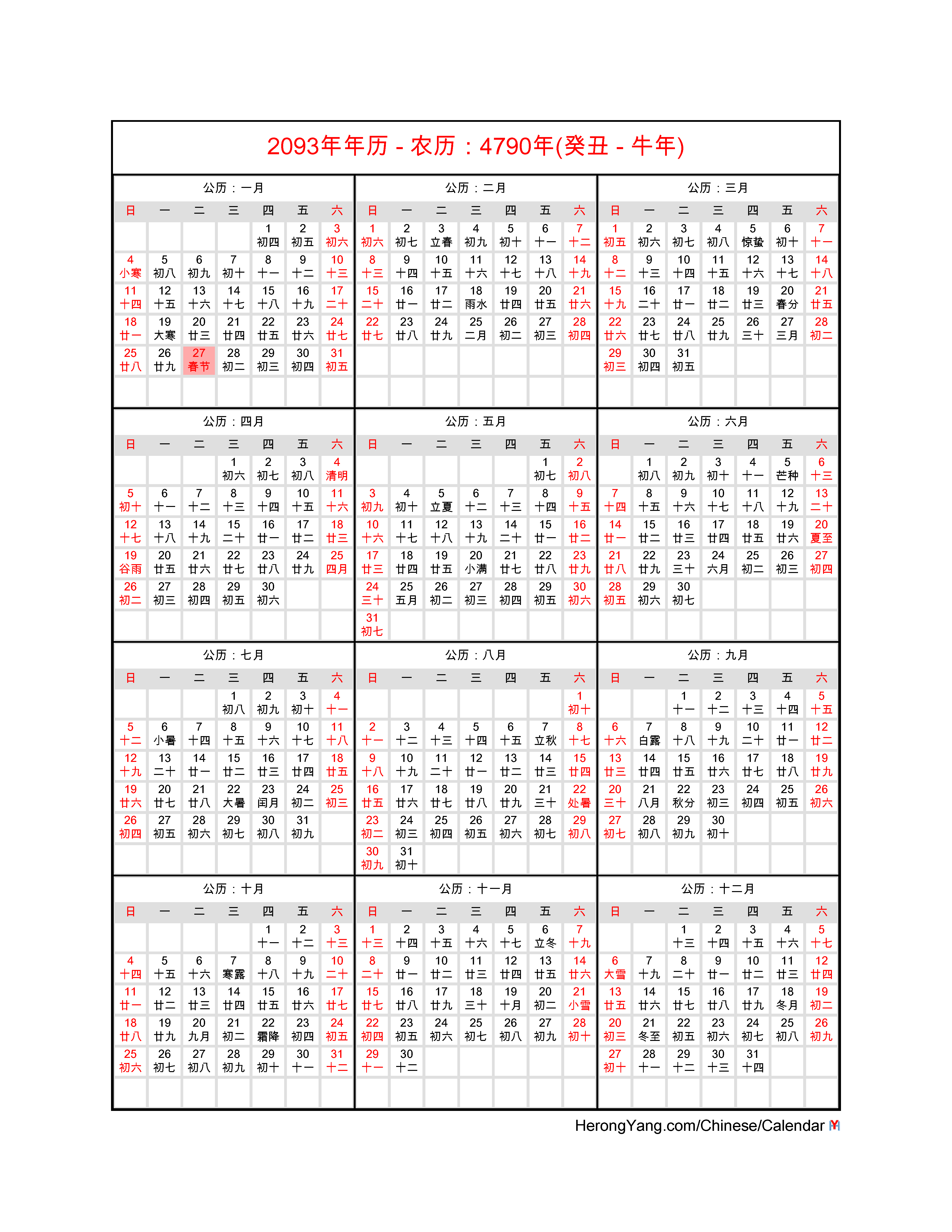 Free Chinese Monthly Calendar for Year 2093