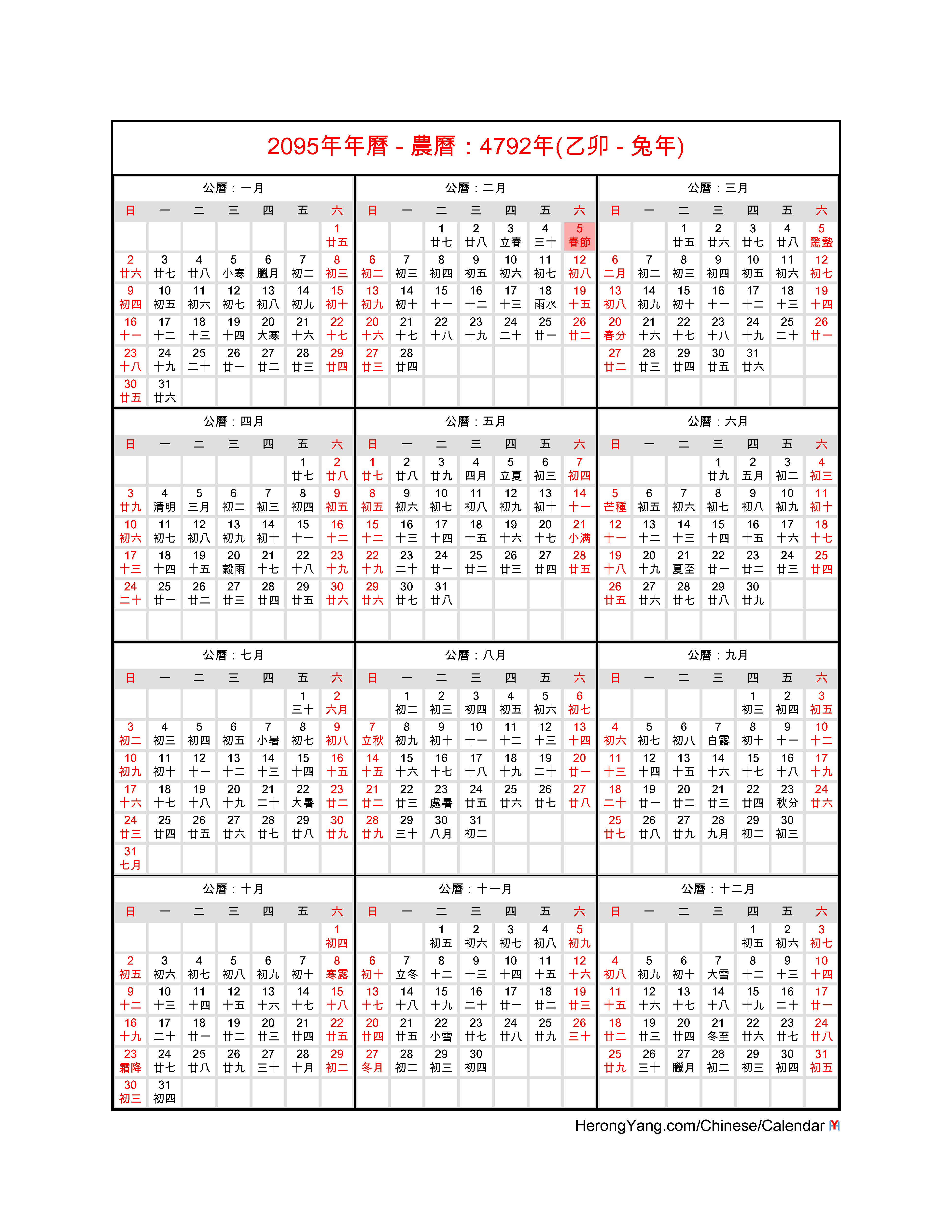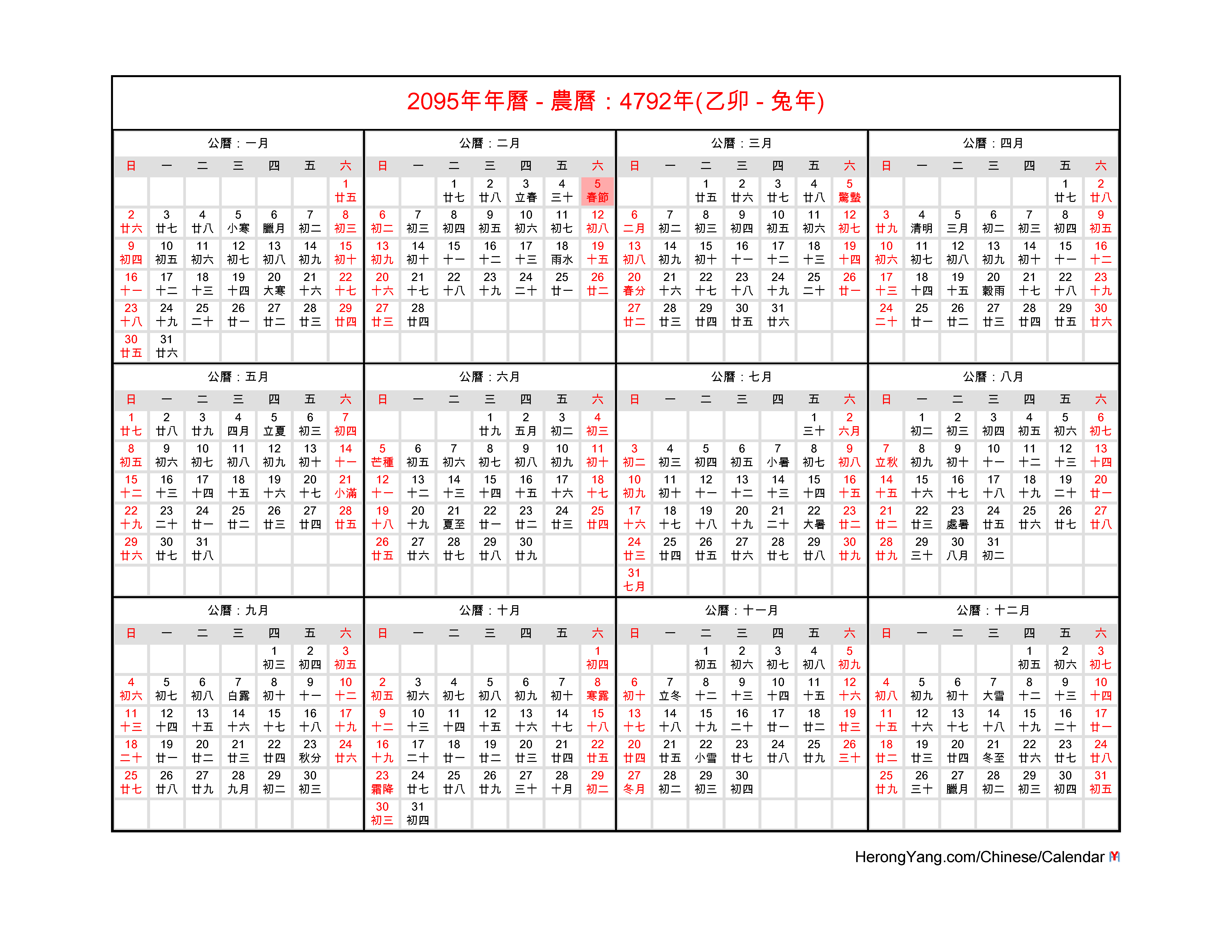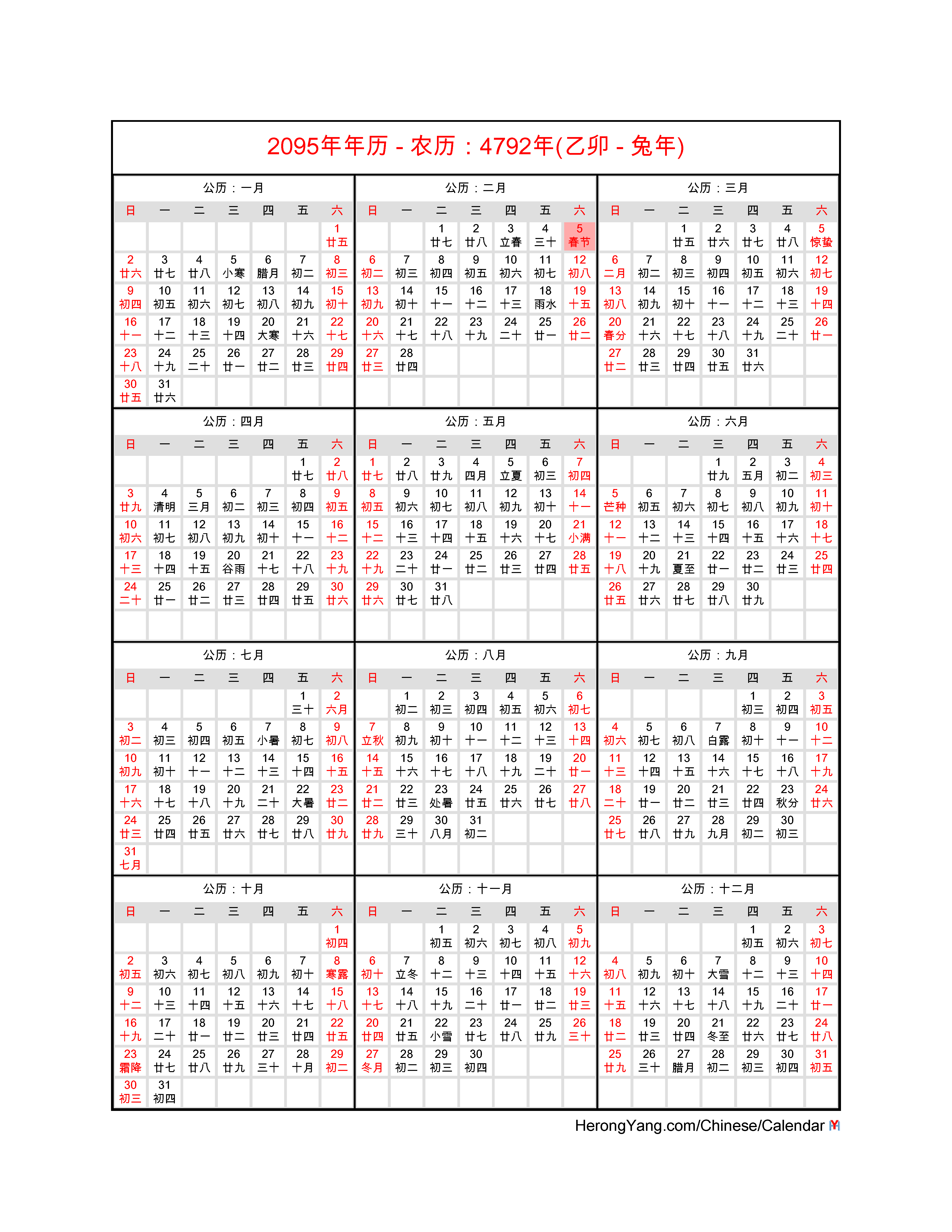 Free Chinese Calendar 2095 - Year of the Rabbit