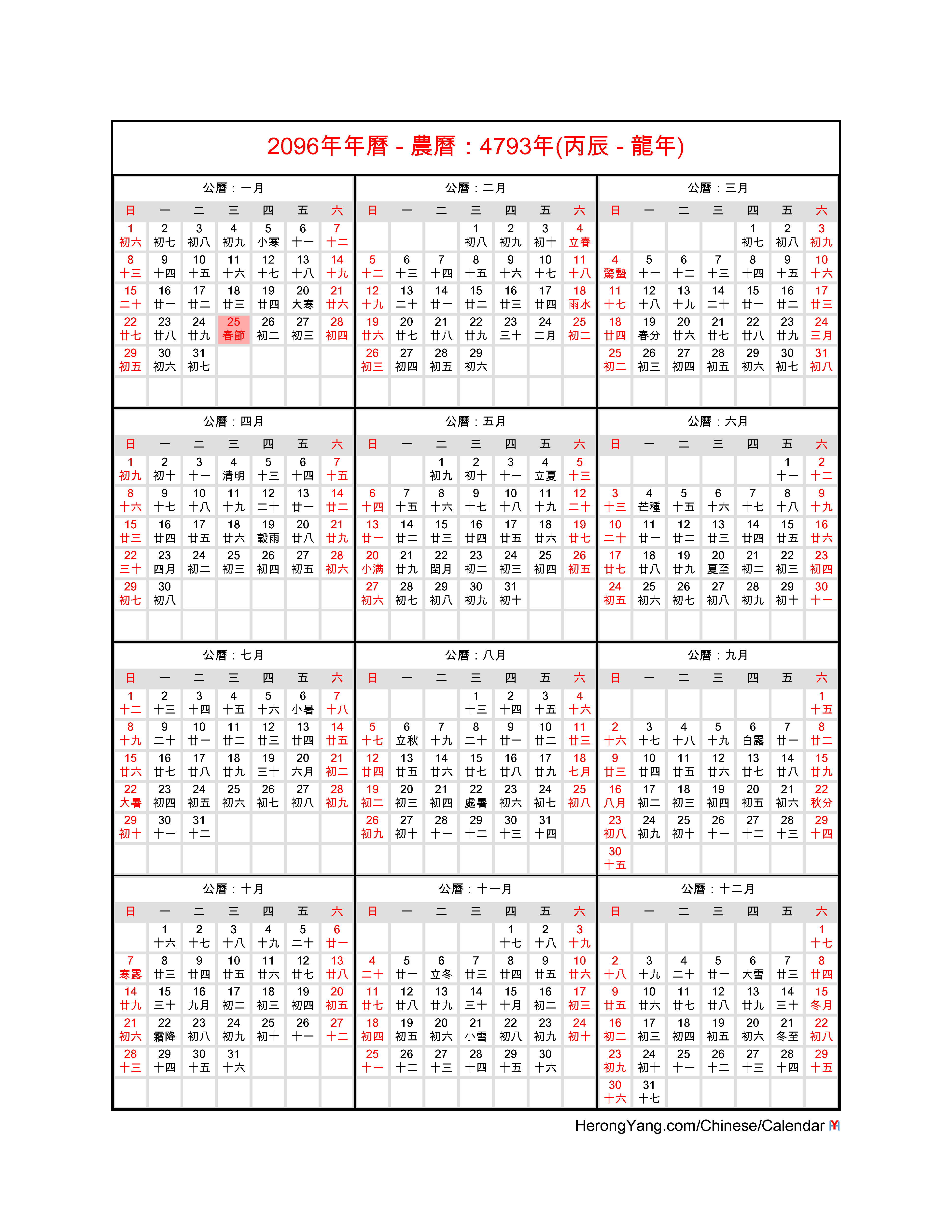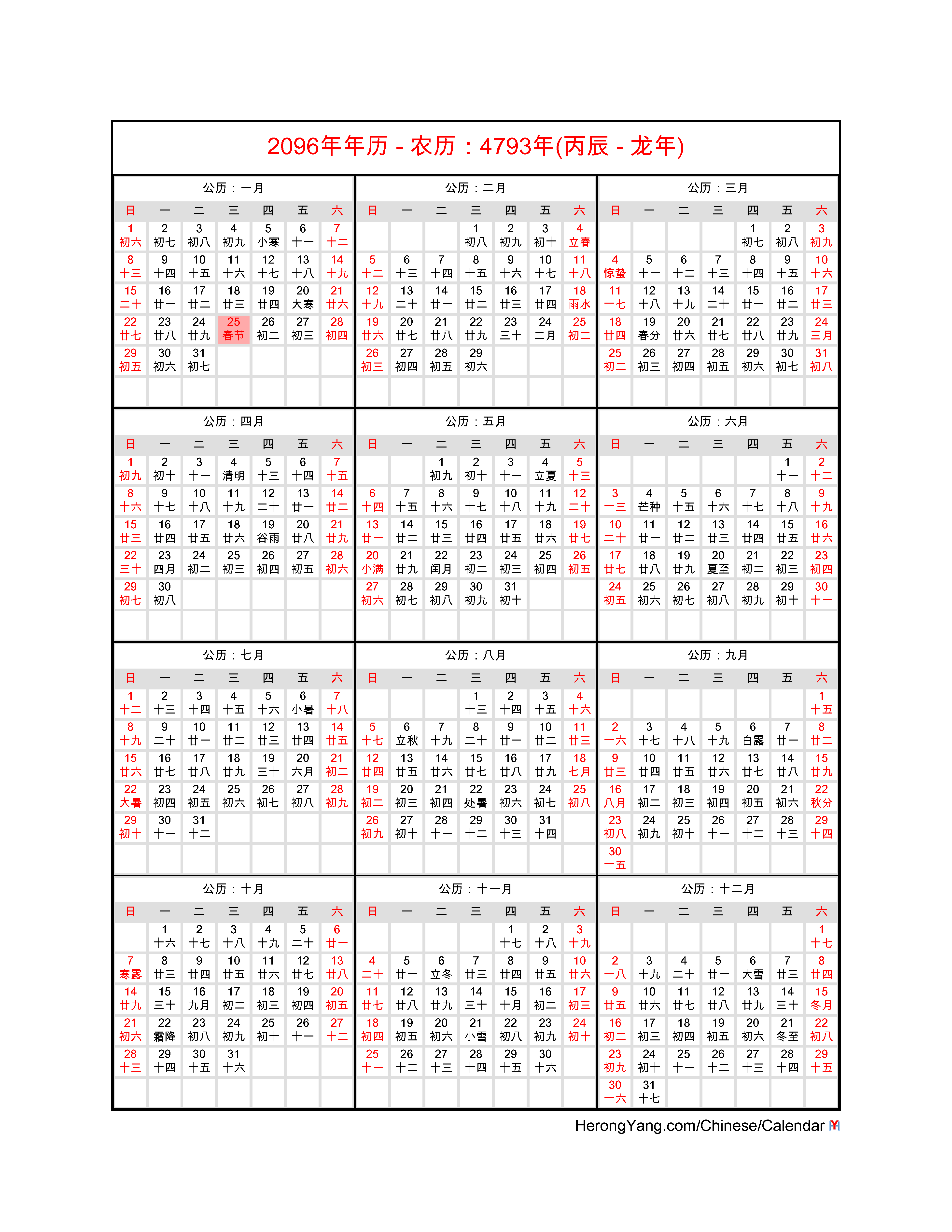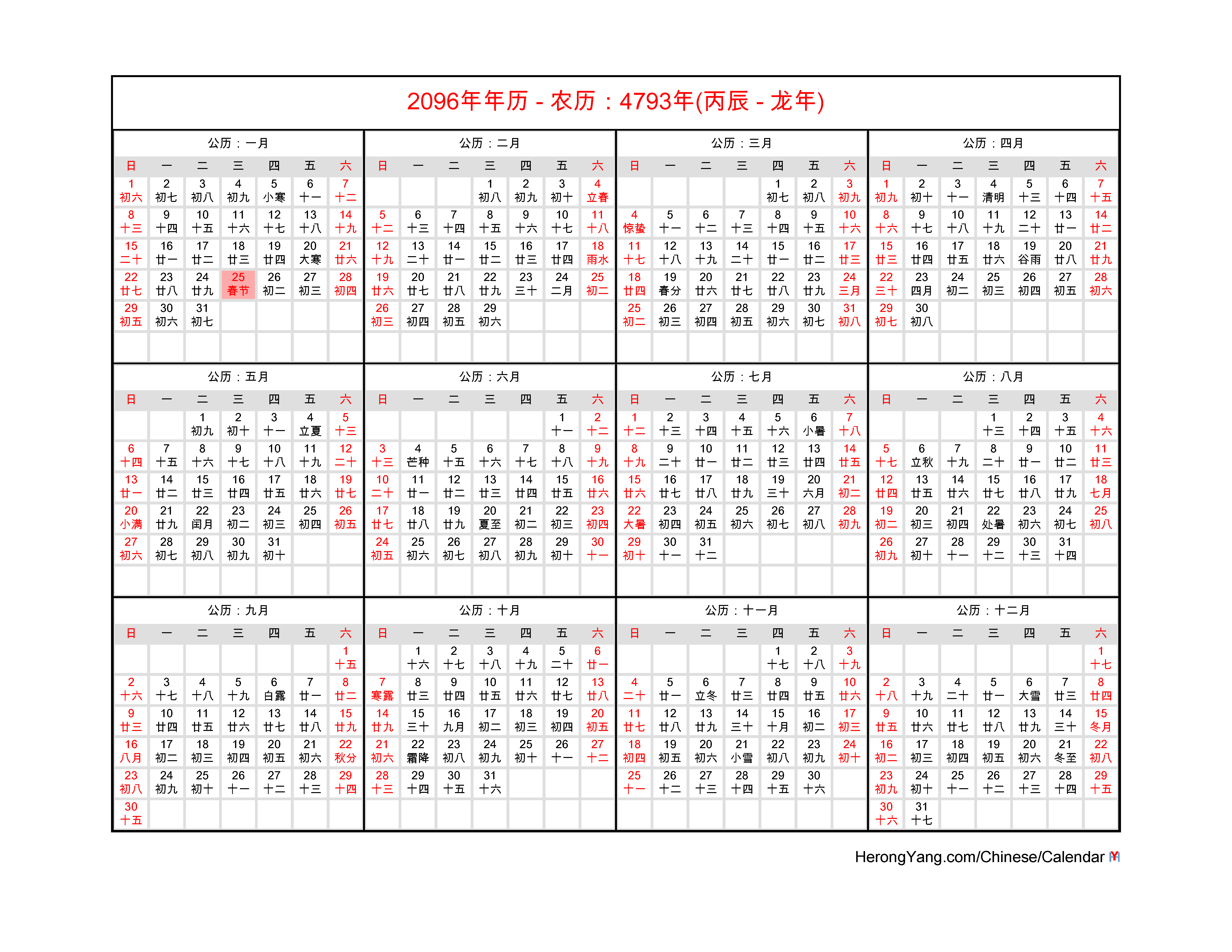 Want to know when is the 2096 Chinese New Year day? Look for free Chinese calendars for 2096?