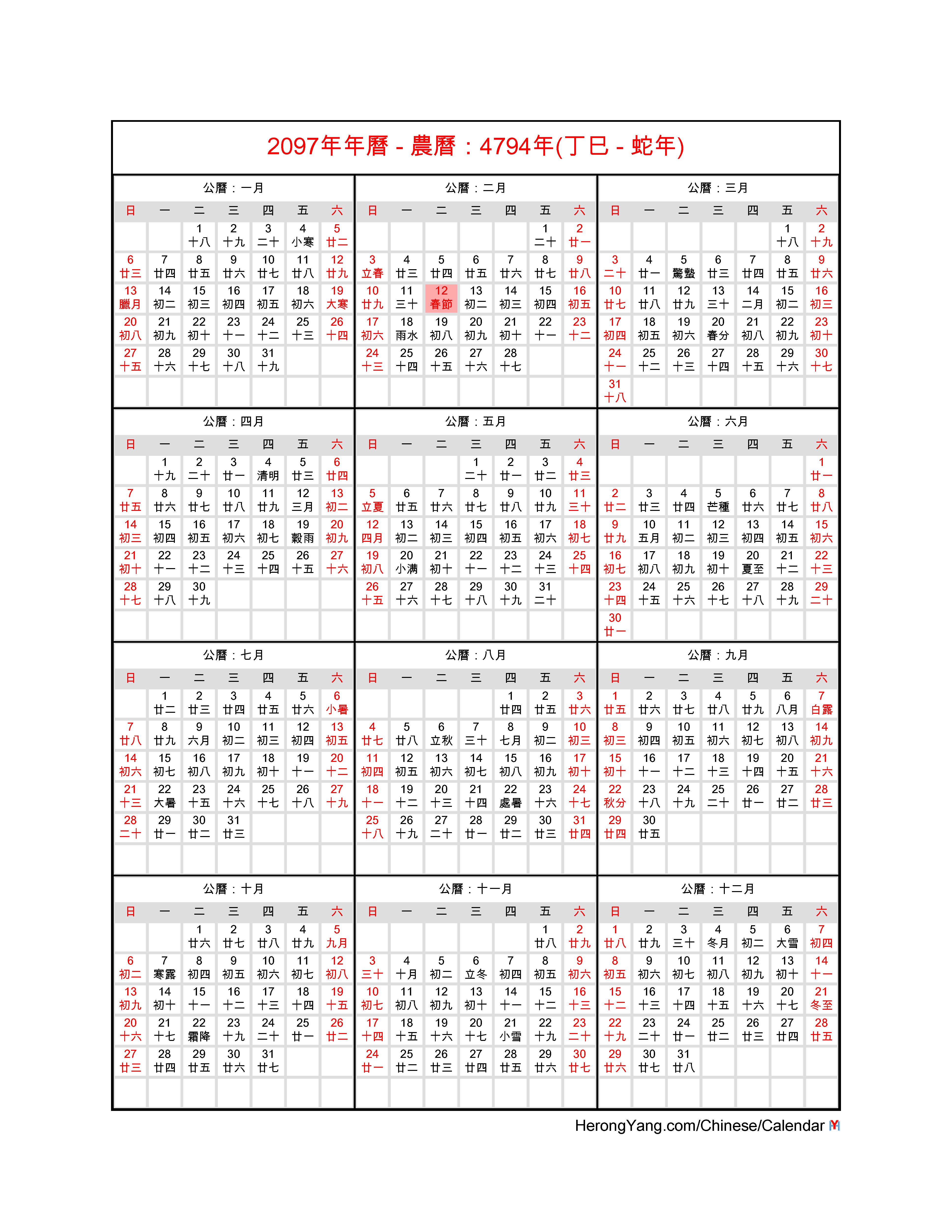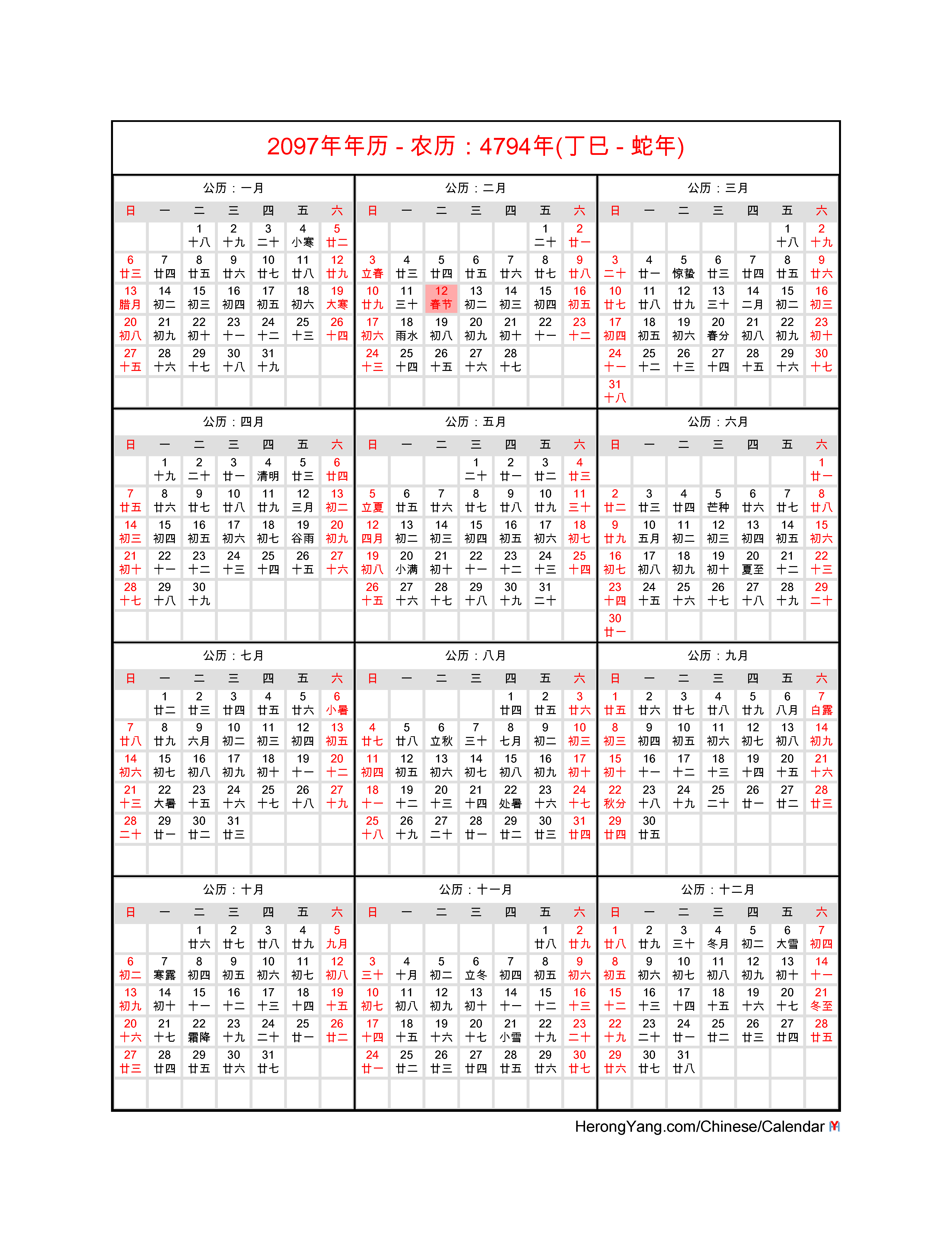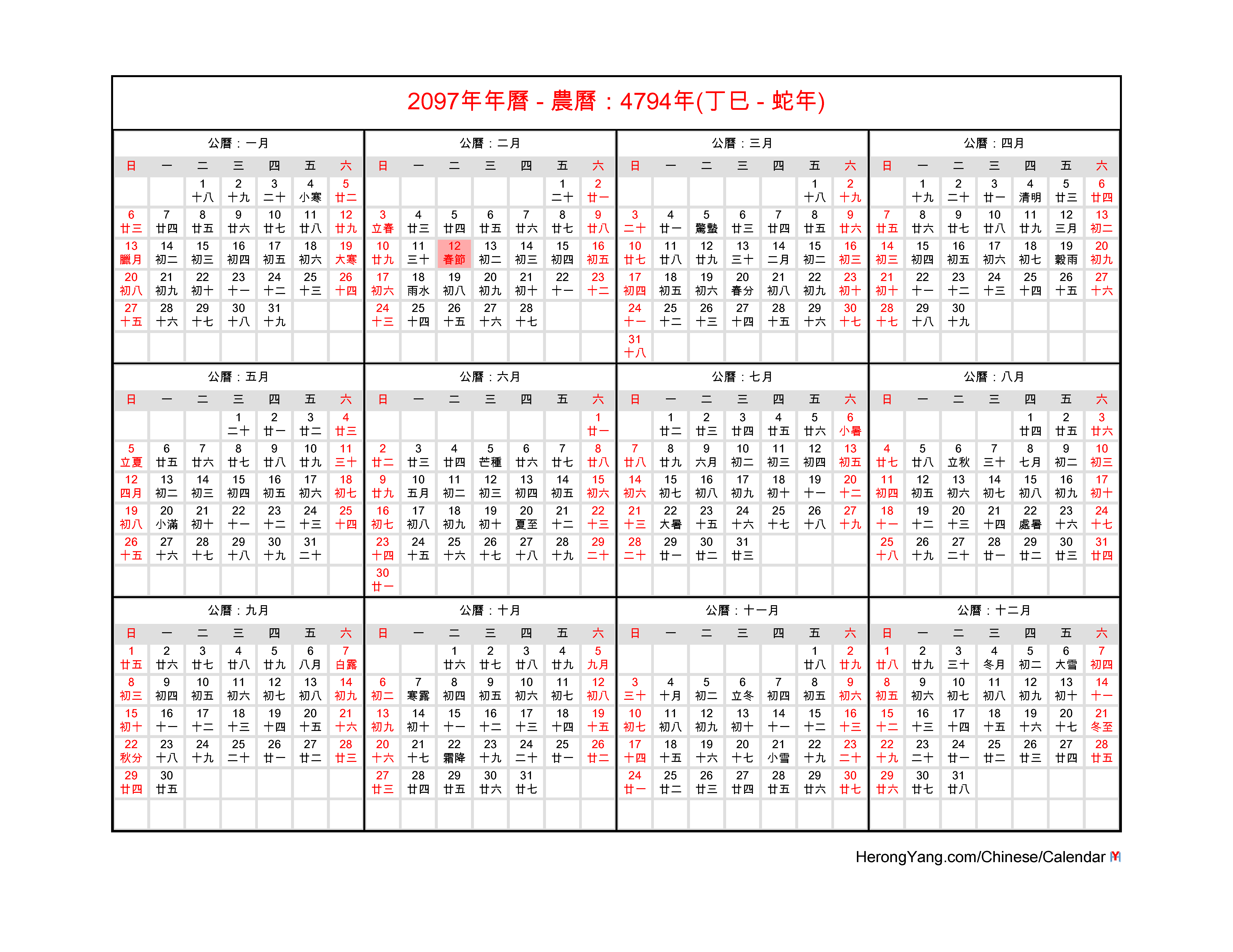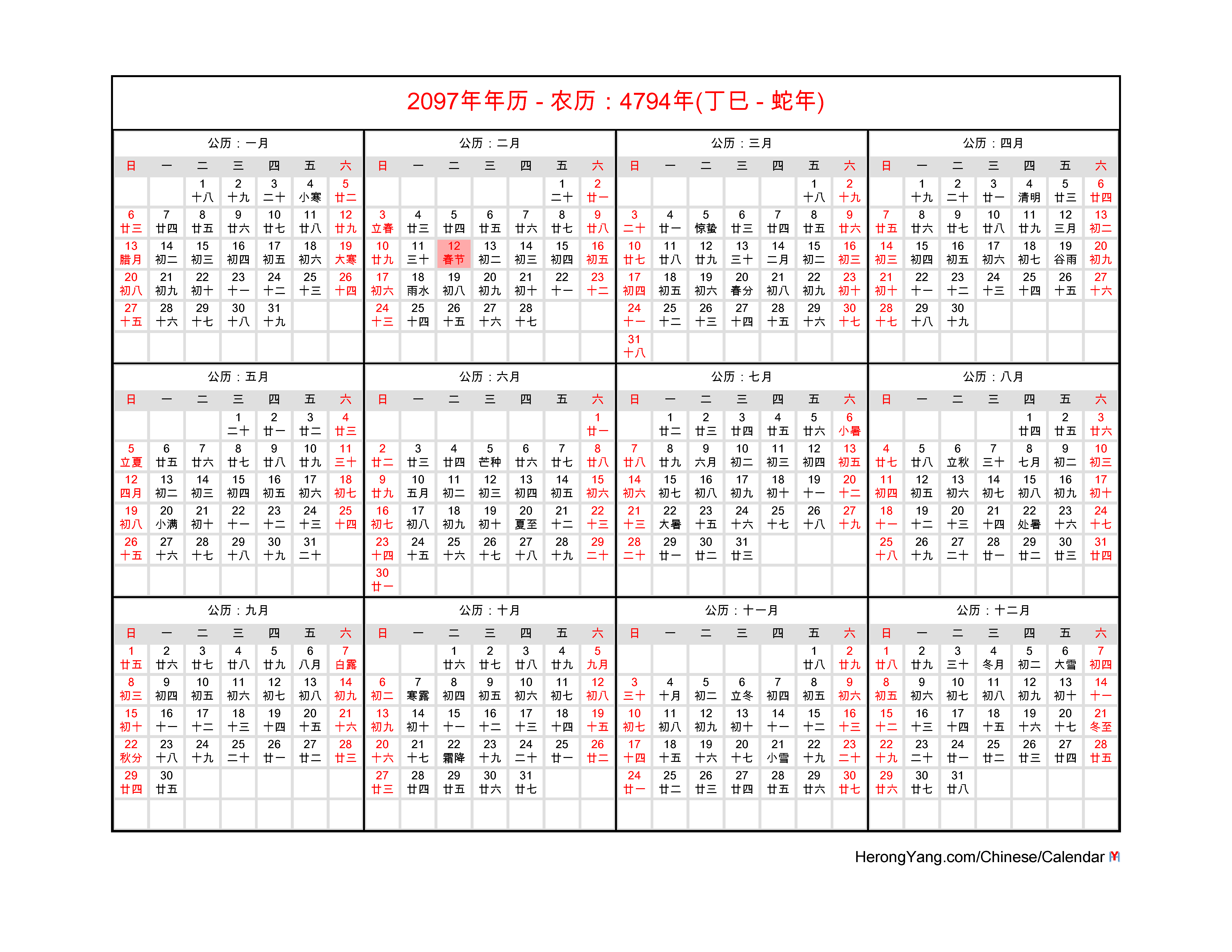 Want to know when is the 2097 Chinese New Year day? Look for free Chinese calendars for 2097?