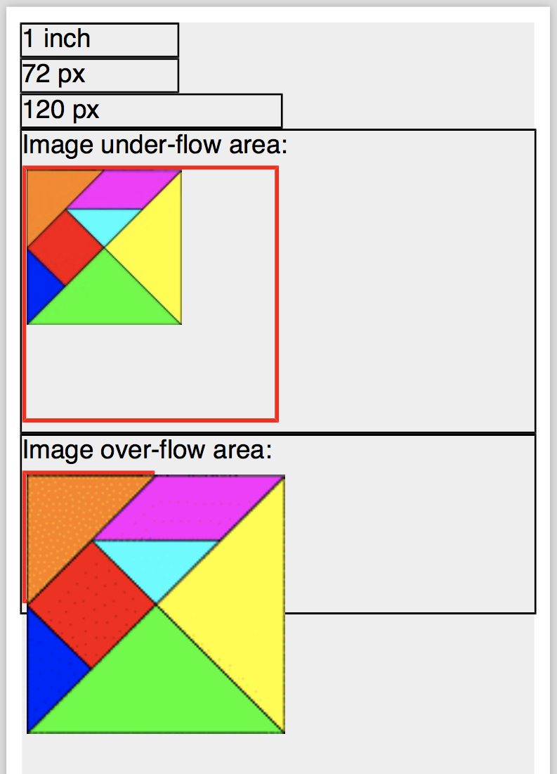 Let's assume that I have a tangram image of 120x120 pixel stored in 2 files: Tangram-120-DPI.jpg with 120 DPI resolution properties included, and Tangram-No-DPI.gif with no resolution properties included. Here is my tutorial example, external-graphic-Over-Under-Flow.fo, that displays the tangram image in two blocks differently: