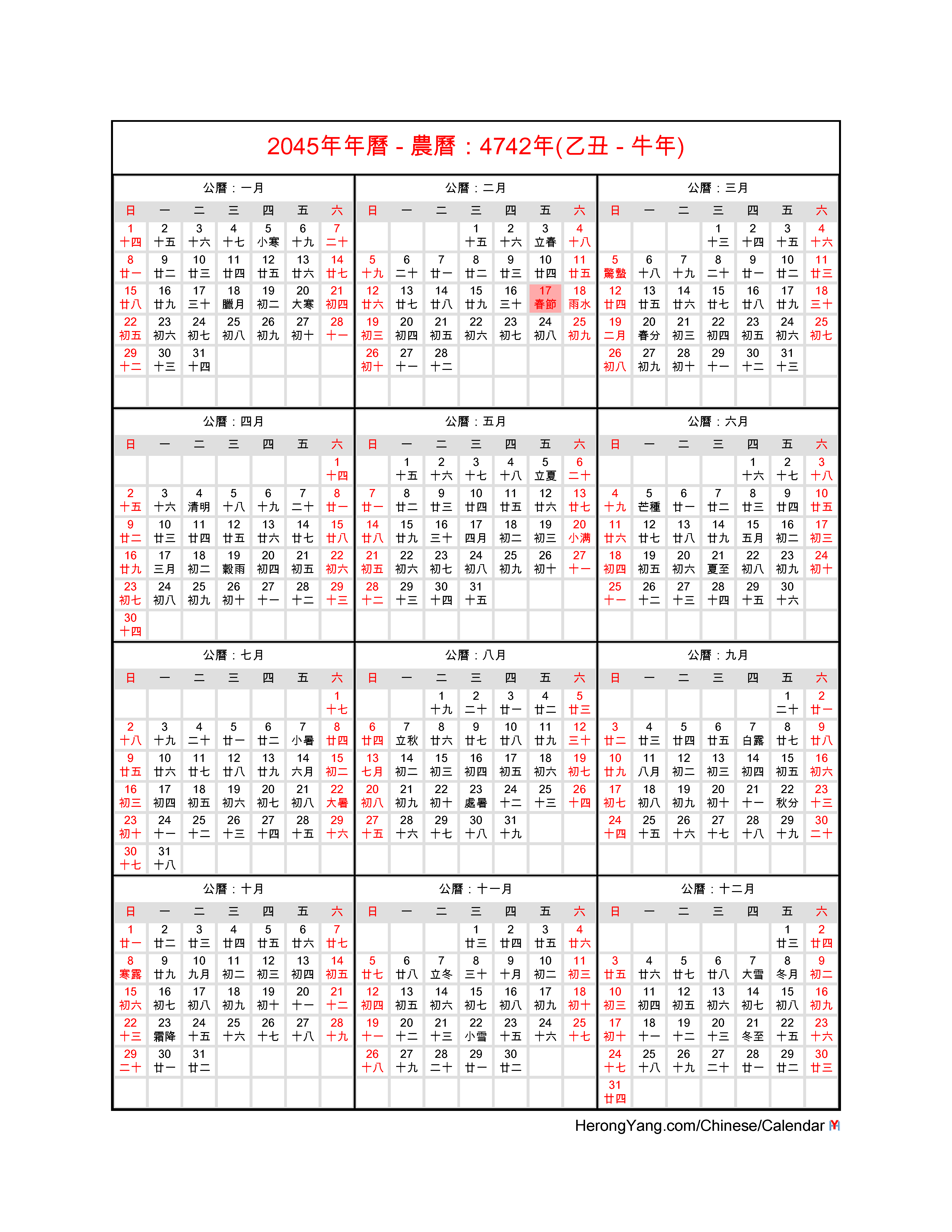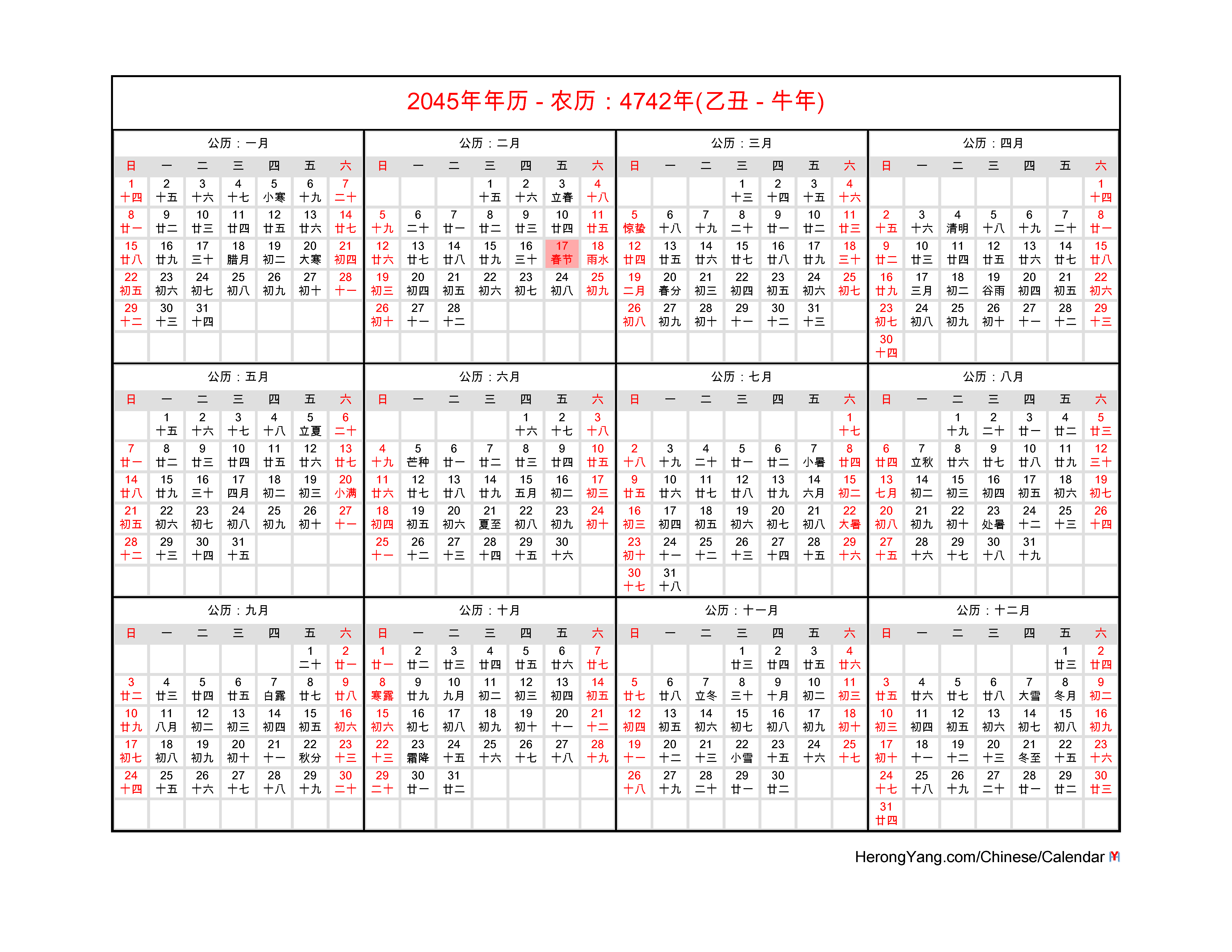 Free Chinese Calendar 2045 - Year of the Ox