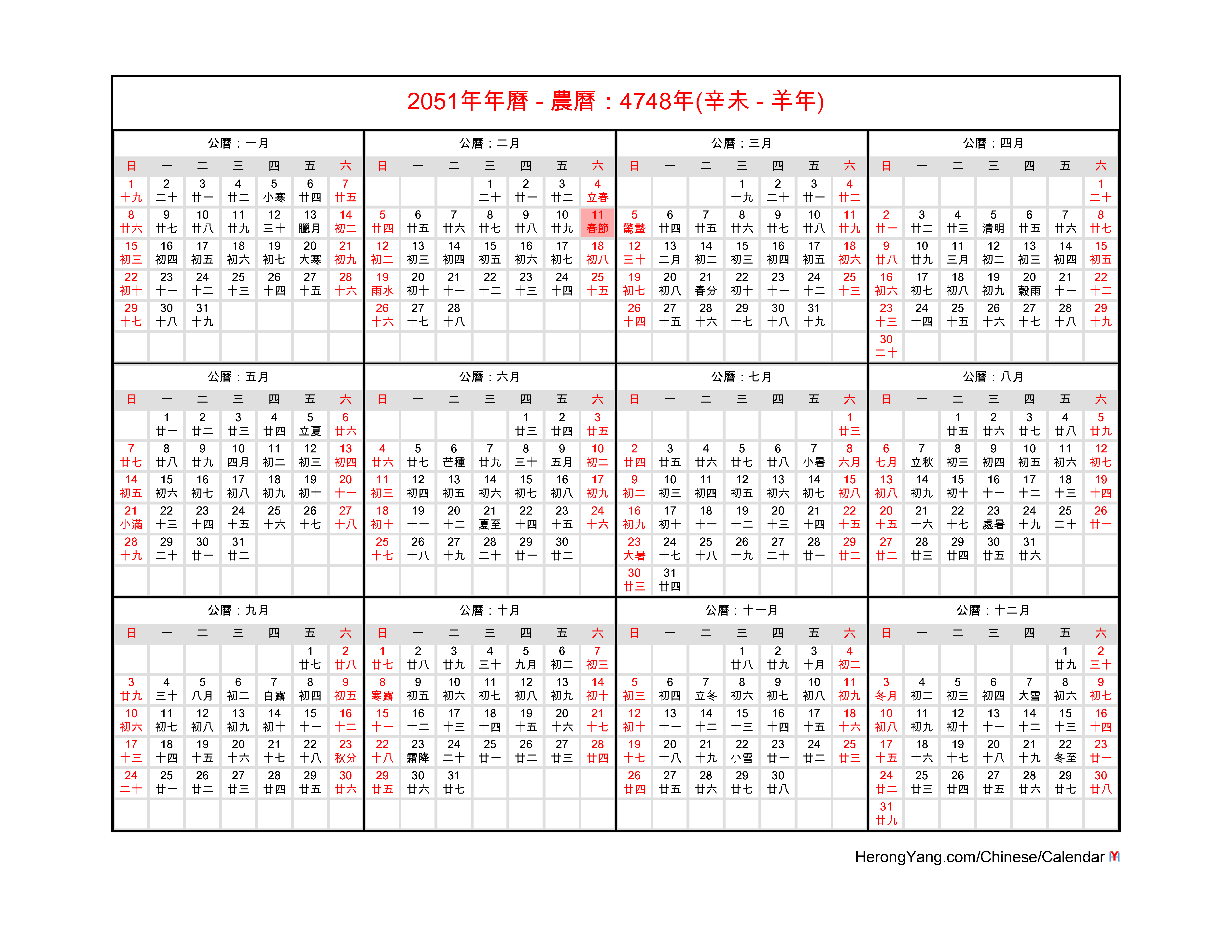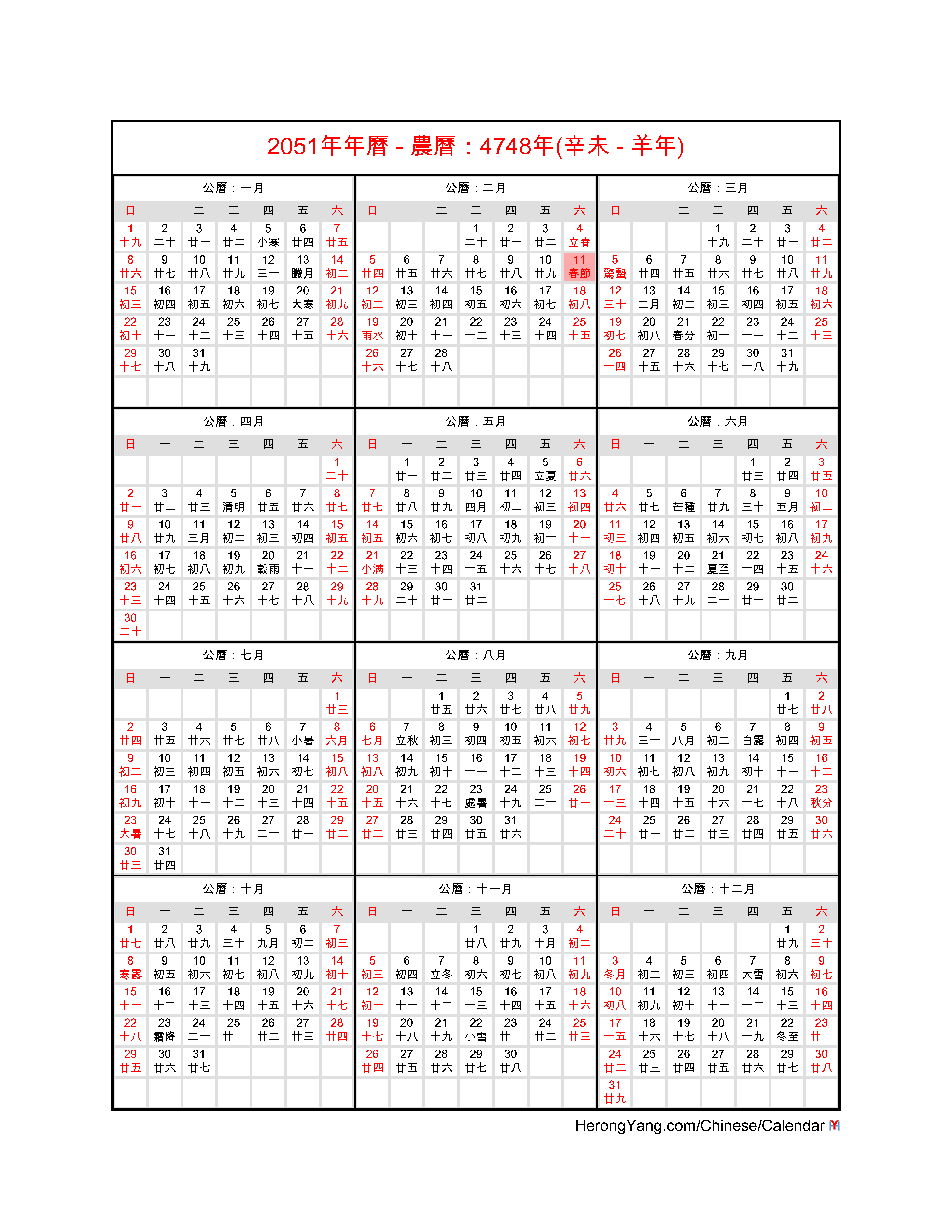 Free Chinese Calendars in Different Formats for Year 2051