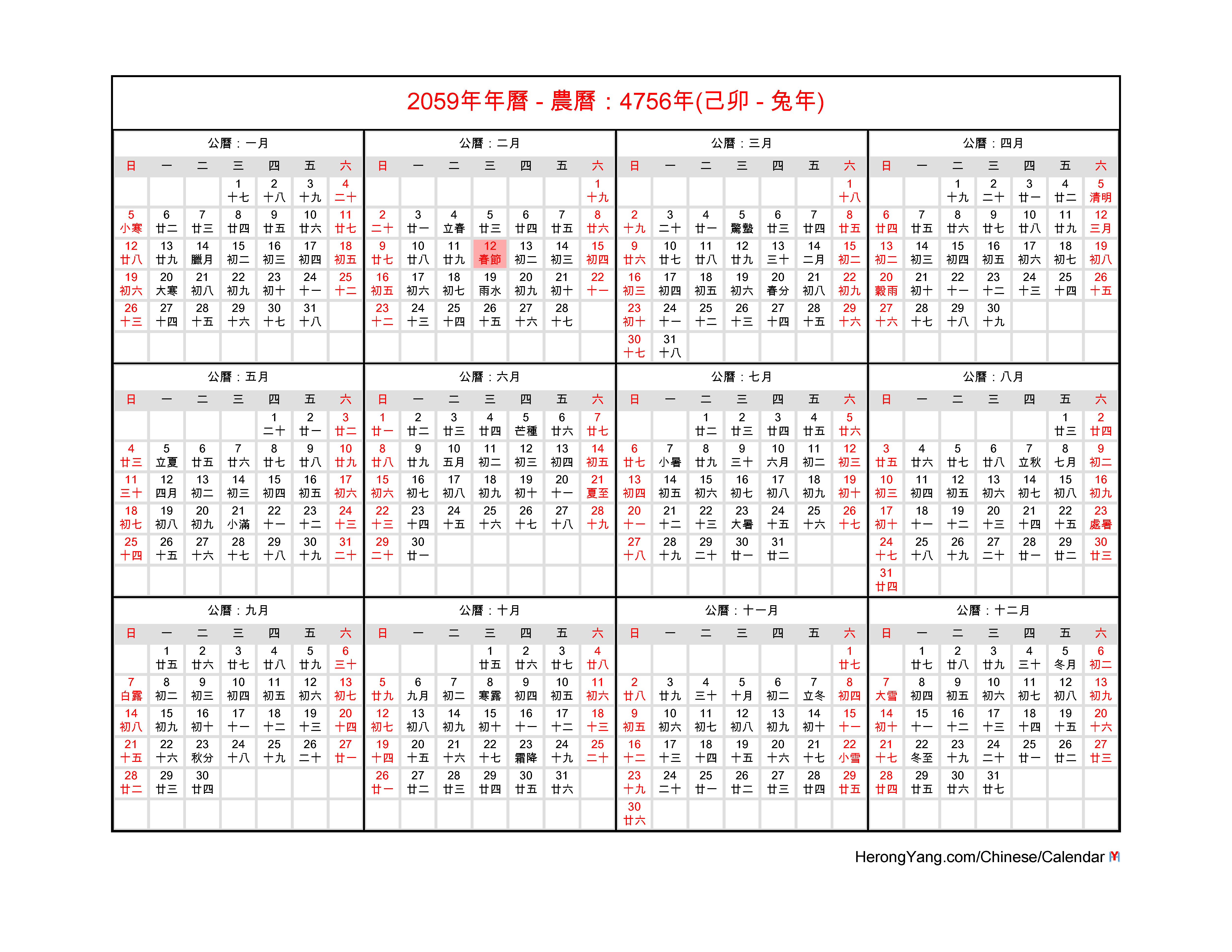 Free Chinese Calendar 2059 - Year of the Rabbit