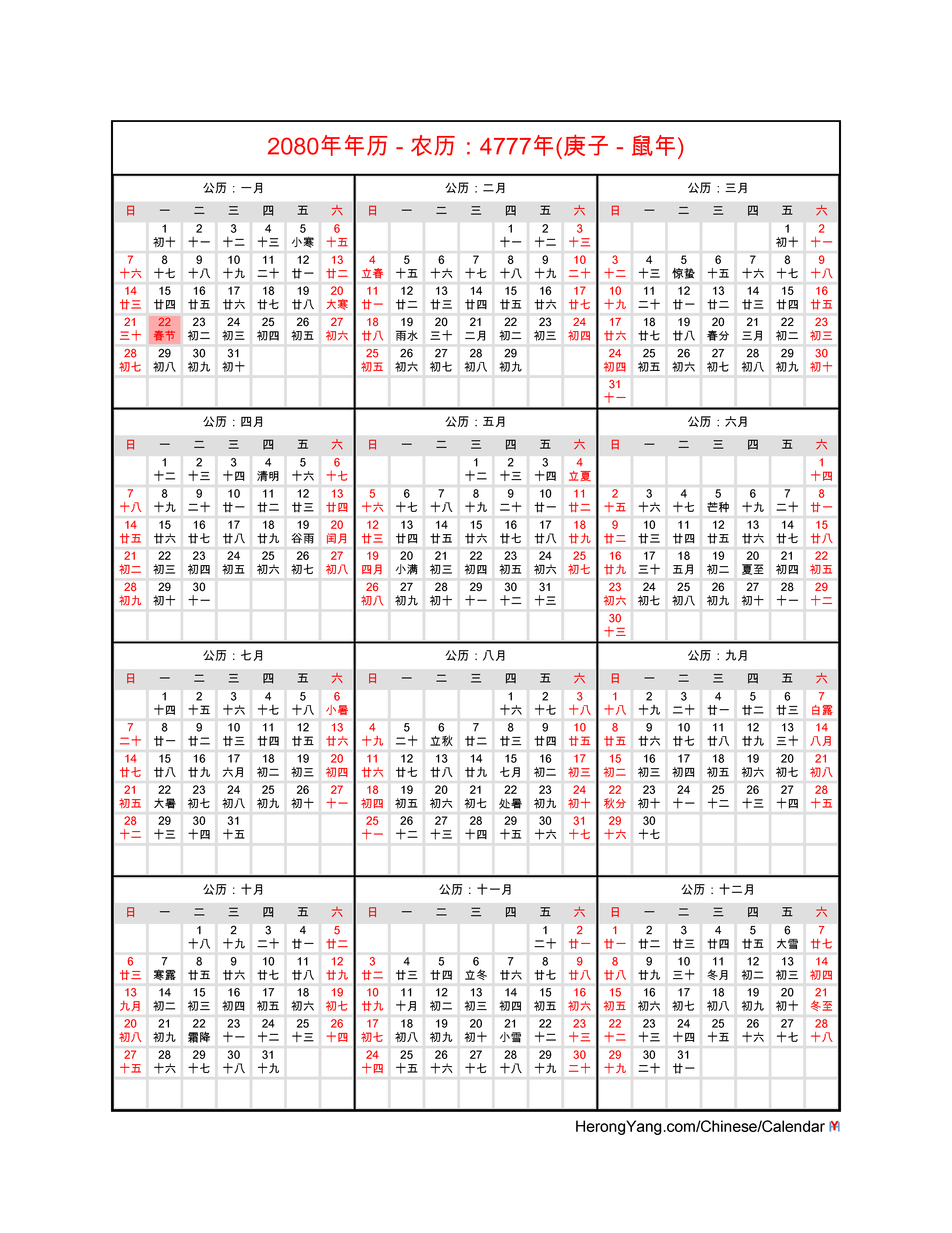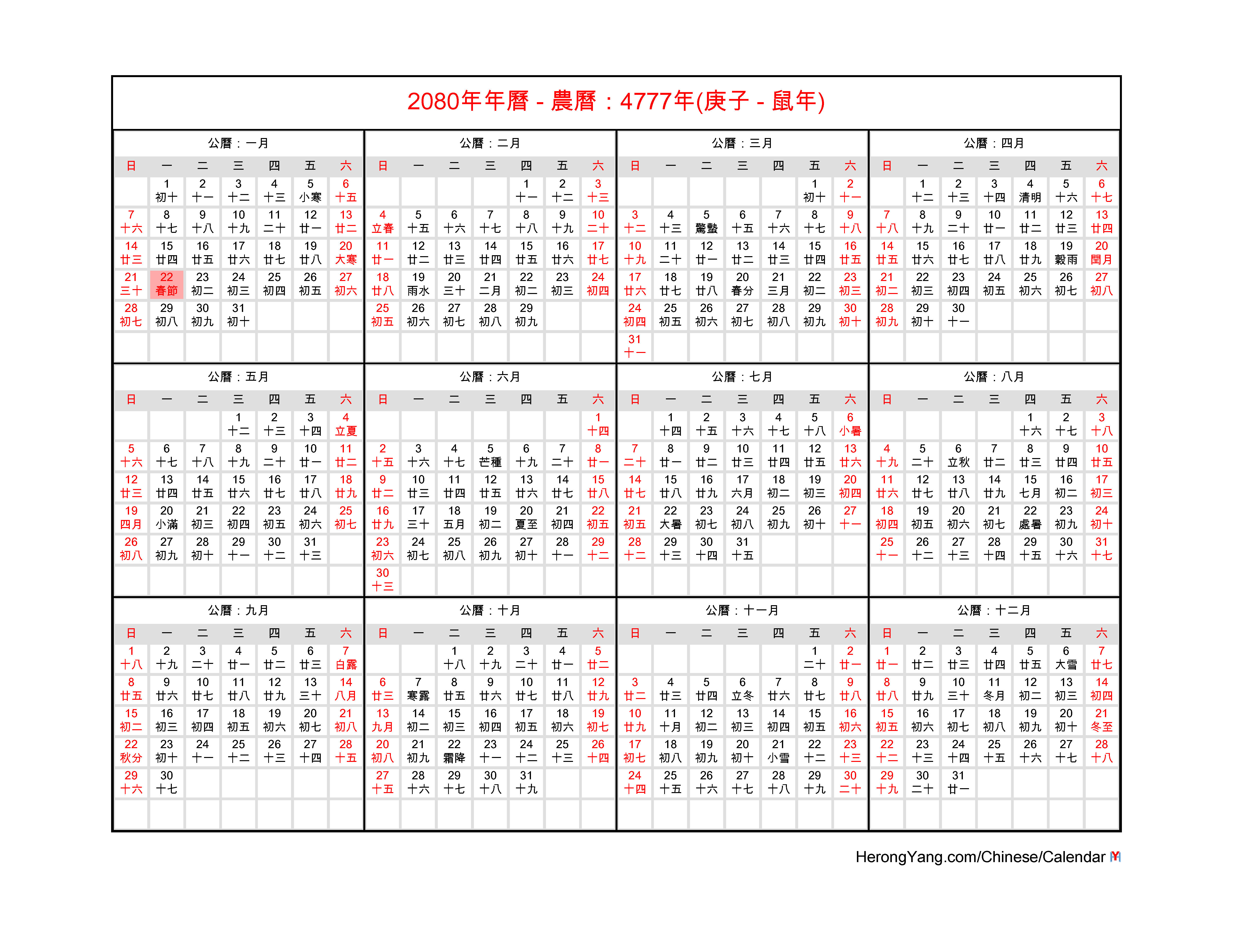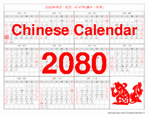 Want to know when is the 2080 Chinese New Year day? Look for free Chinese calendars for 2080?