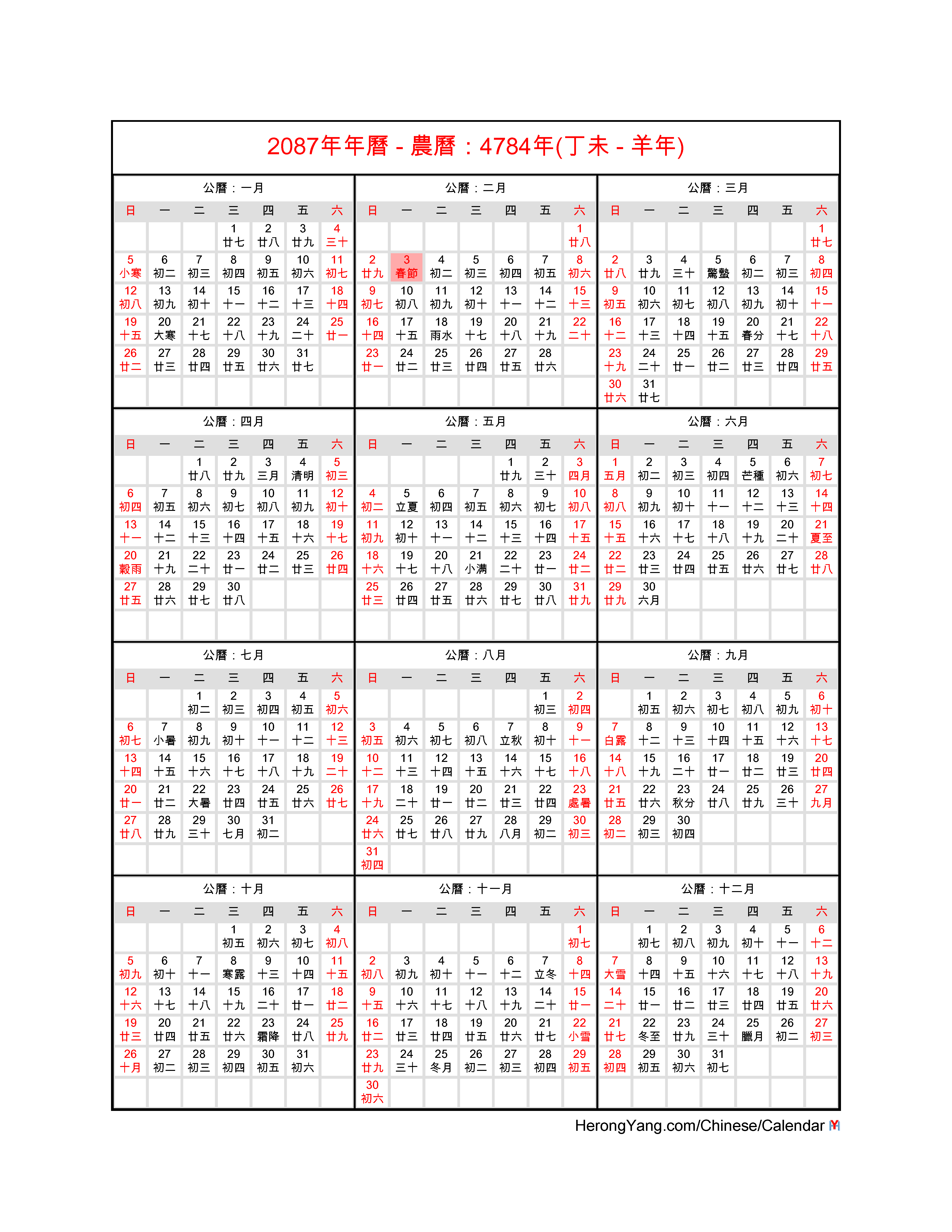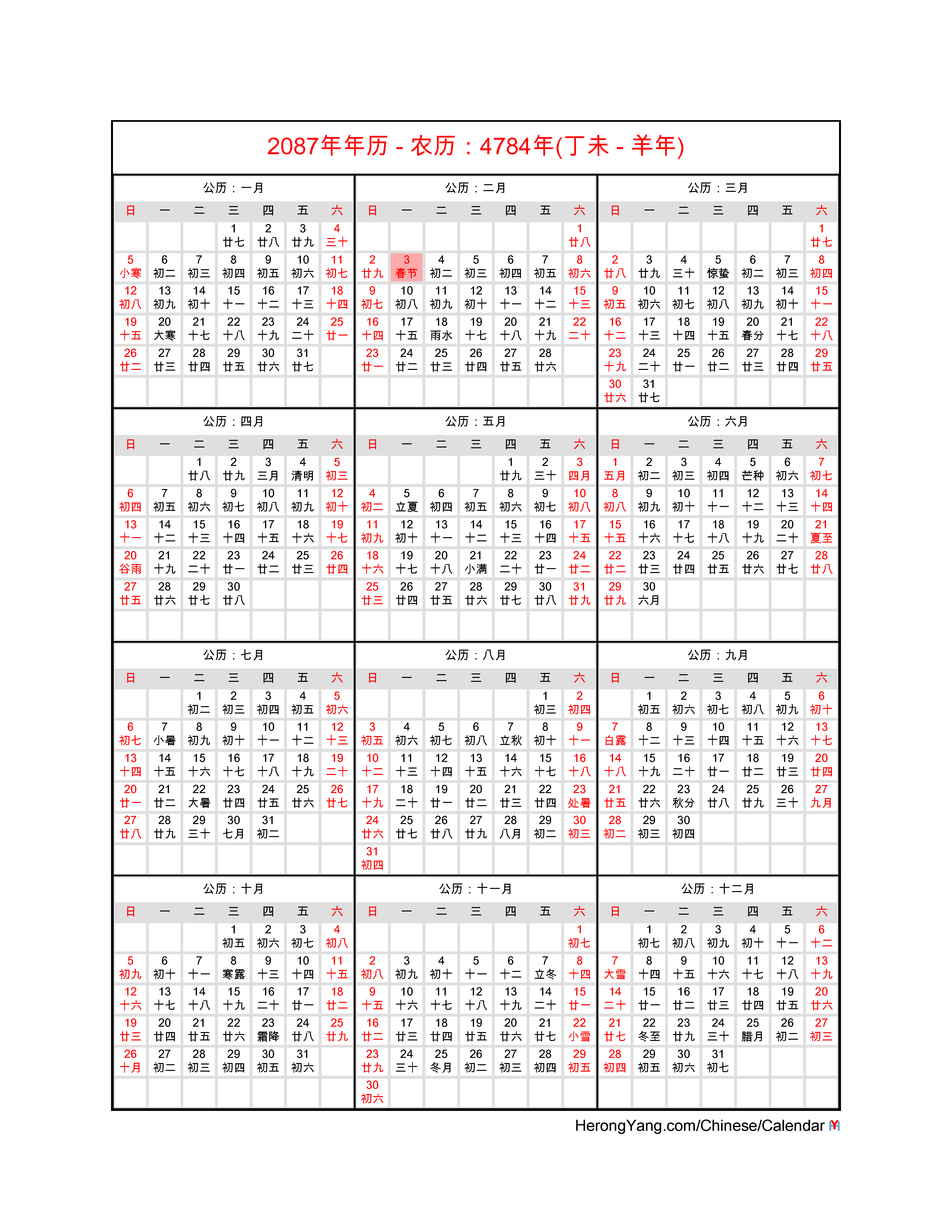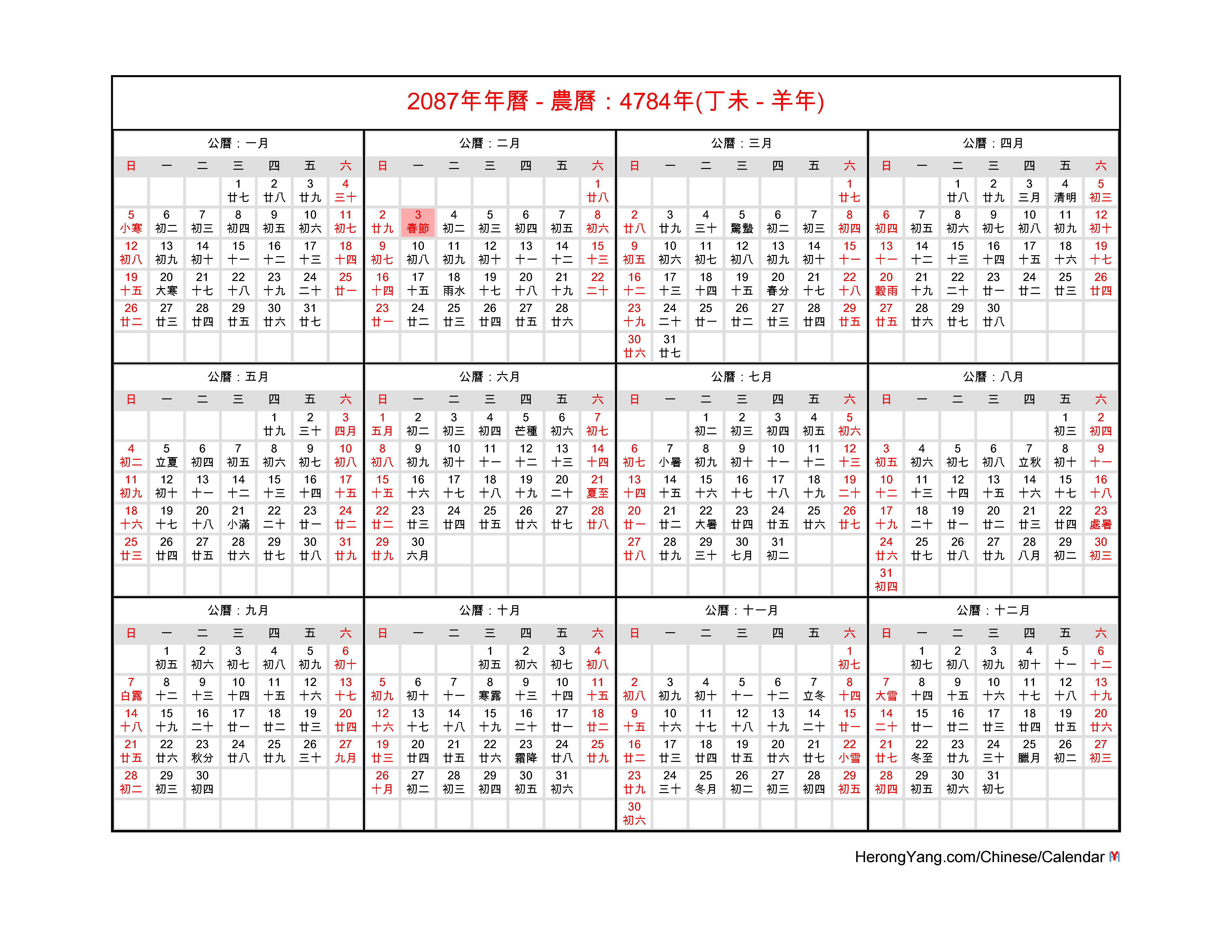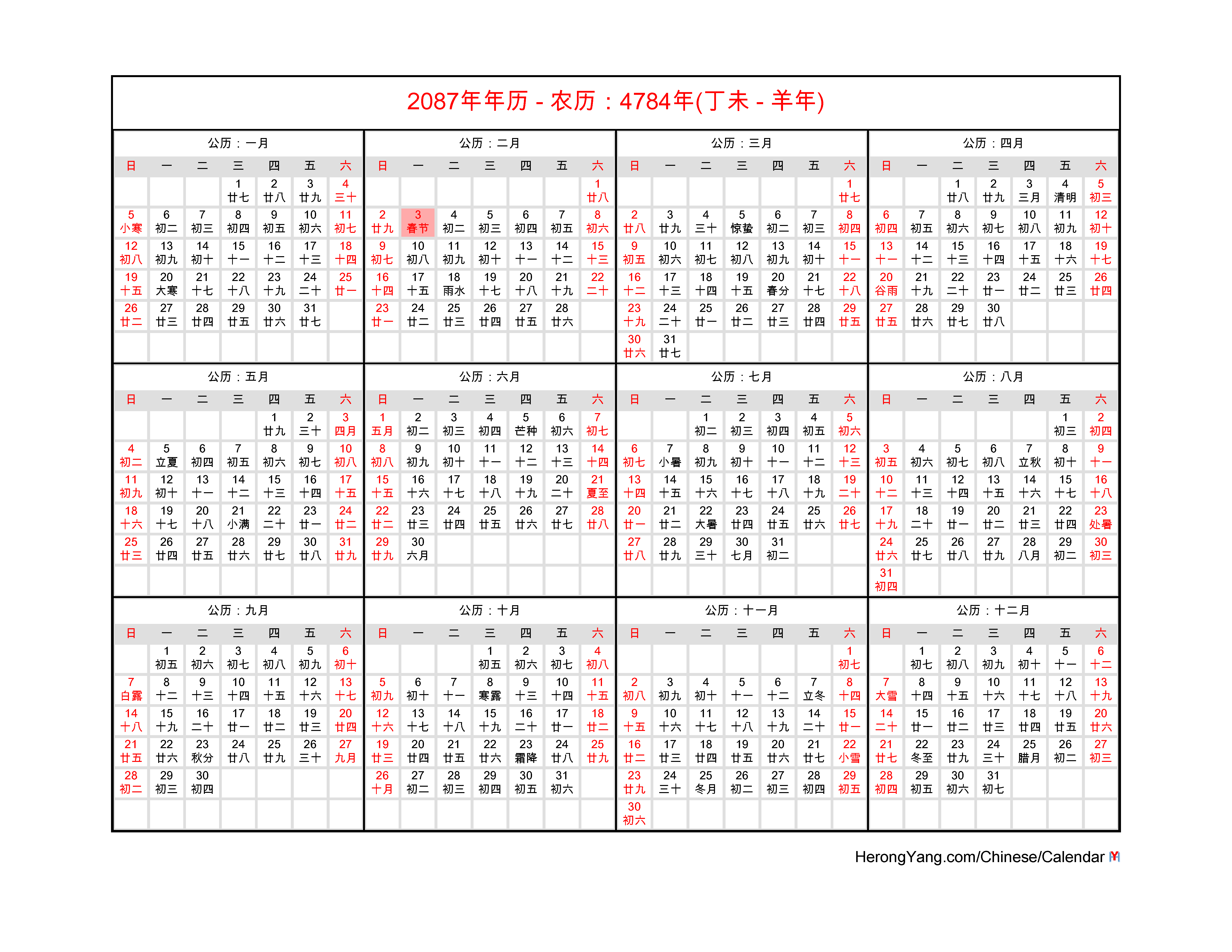 Want to know when is the 2087 Chinese New Year day? Look for free Chinese calendars for 2087?