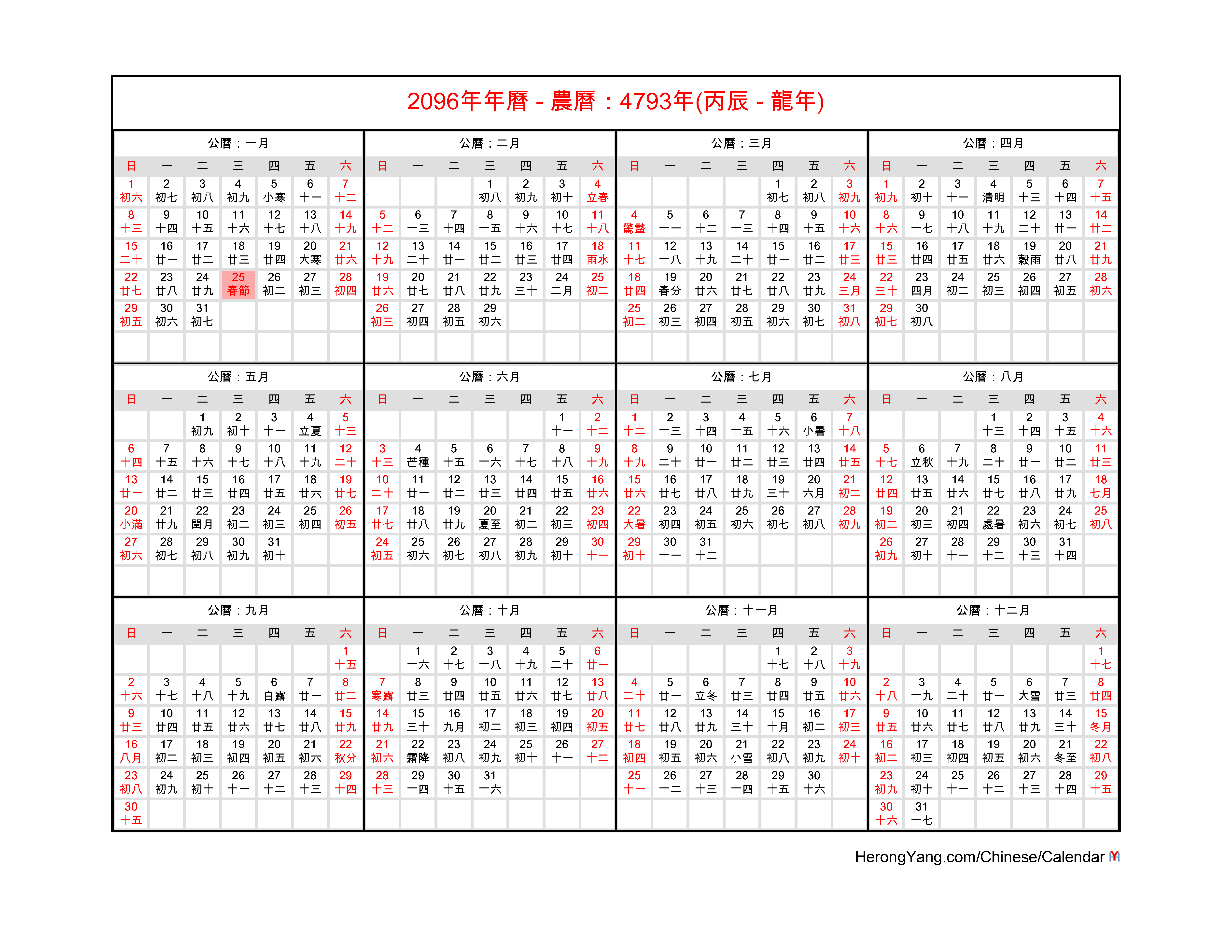 Want to know when is the 2096 Chinese New Year day? Look for free Chinese calendars for 2096?